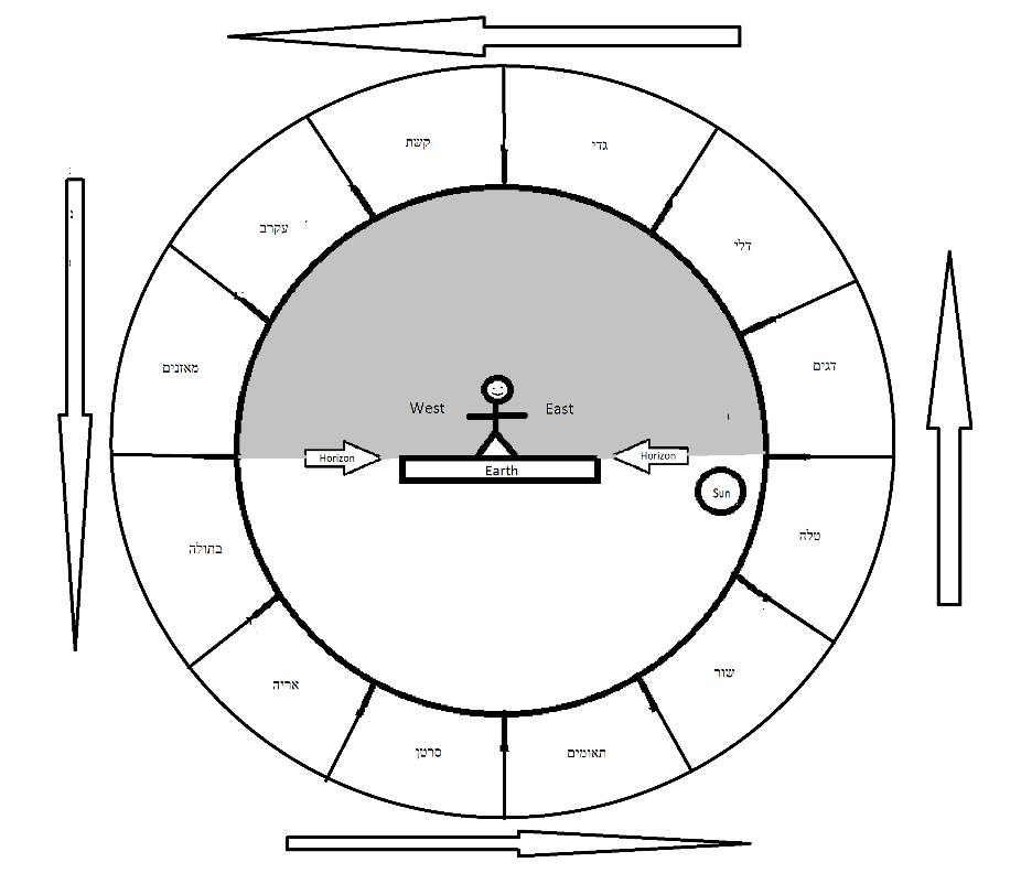 To better understand this סוגיא as explained by רשי", the following diagrams presented from an earth-centered perspective, where the earth is standing still. It is neither spinning, nor orbiting the sun. The man is standing on the surface of the earth facing south.
