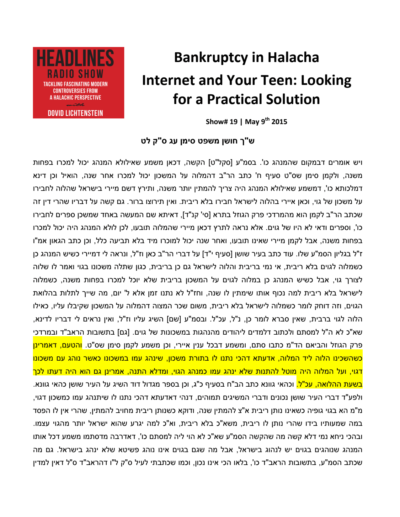 Bankruptcy in Halacha; Internet and Your Teen - Looking for a Practical Solution
