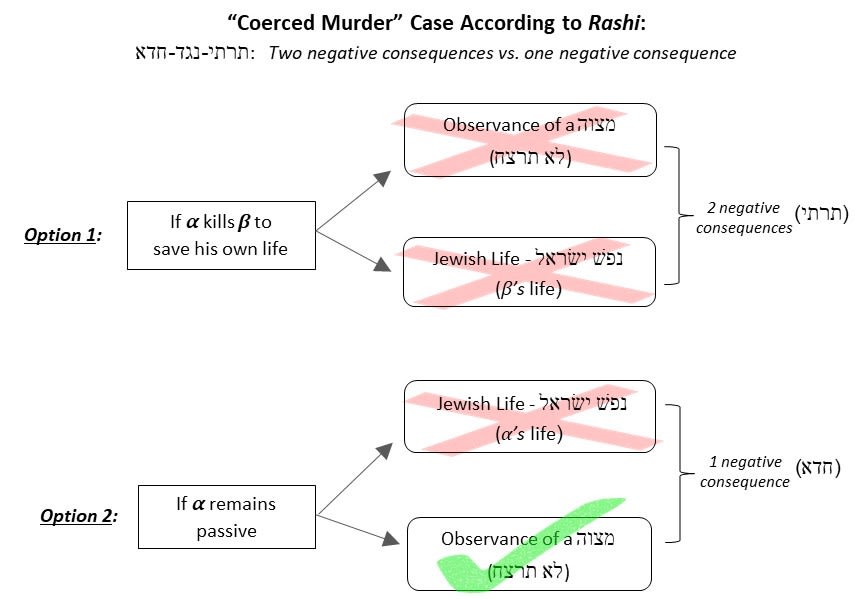 A. Rav Moshe portrayed רש״י’s view of the “מאי חזית” logic in the “coerced murder” case as “two negative consequences vs. one negative consequence” (Figure 1, p. 5).